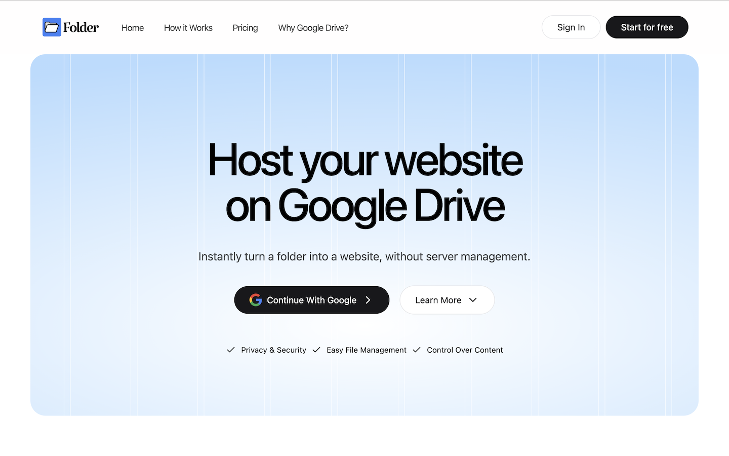 Folder.run turns a shared Google Drive folder into a live website. Just upload your HTML, CSS, JS, and images to the folder, connect it to Folder.run, and your site will be published instantly.